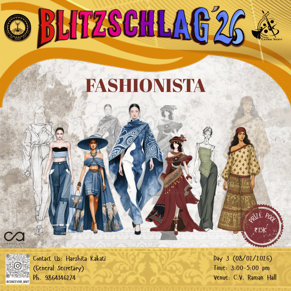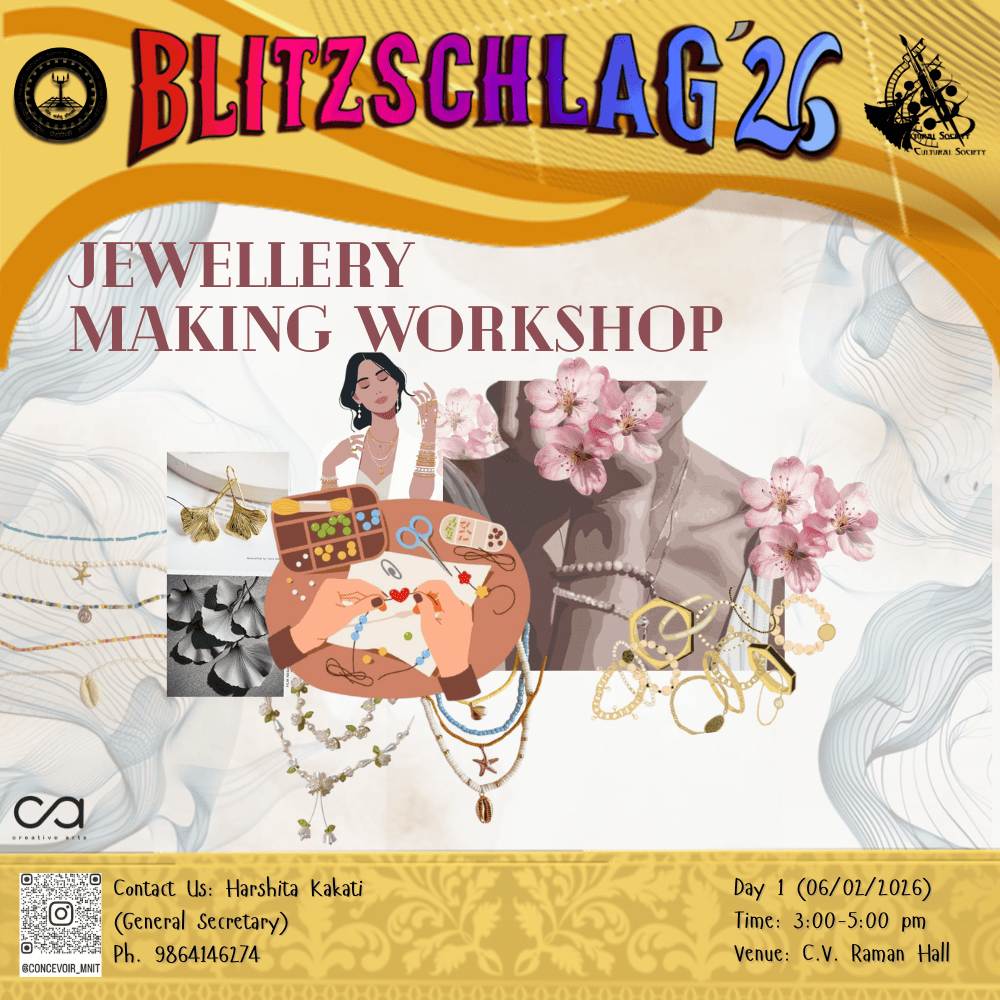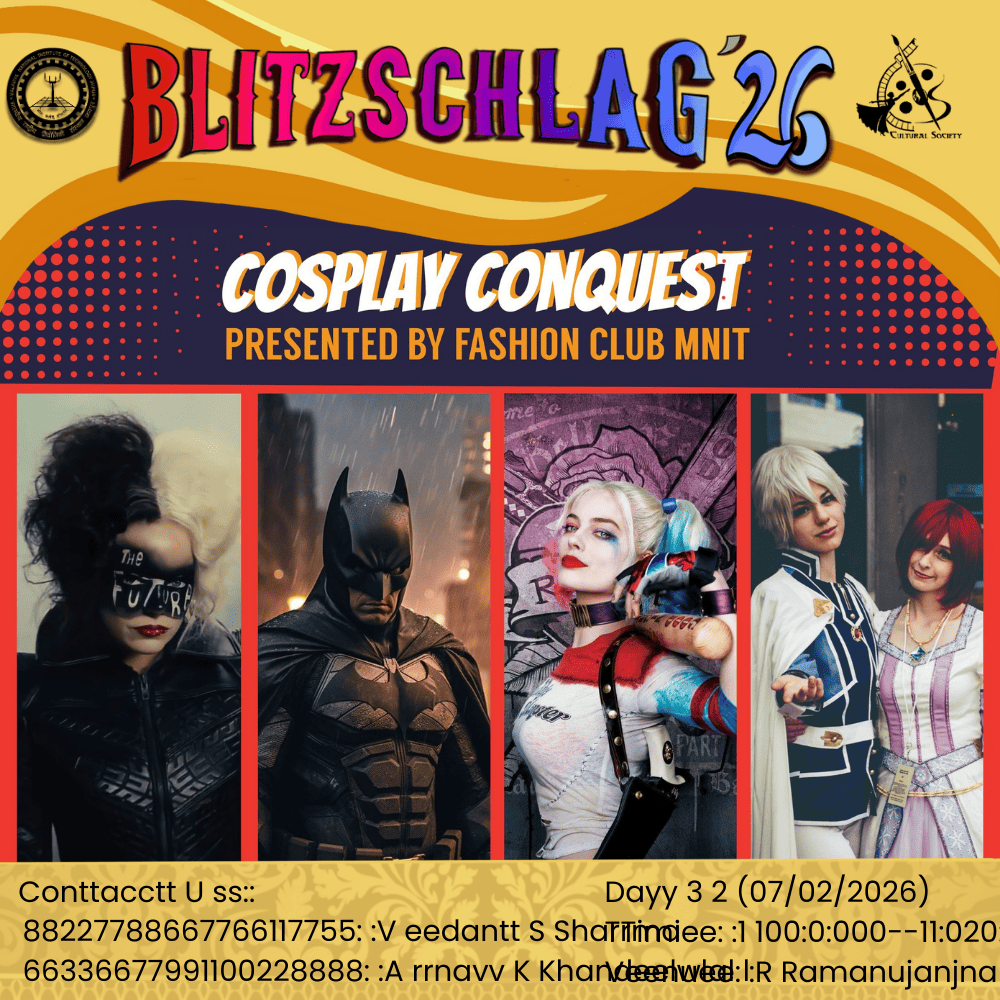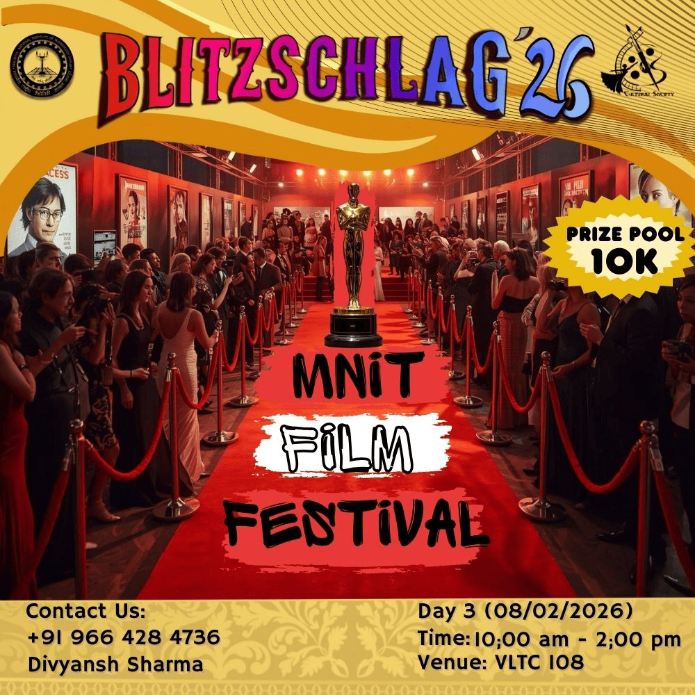 The MNIT Film Festival is a creative platform for participants to showcase their storytelling skills through short films. Participants can choose any theme or genre and bring their ideas to life by scripting, shooting, and editing their own films. The event encourages teamwork, imagination, and originality, giving filmmakers the freedom to experiment with narrative techniques, visuals, sound, and editing. Selected films will be screened during the fest, allowing the audience to enjoy diverse perspectives and cinematic expression in a fun and engaging atmosphere. This event will include the screening of the films submitted or made during the fest and deciding the winners and awarding them with certificates and prizes.