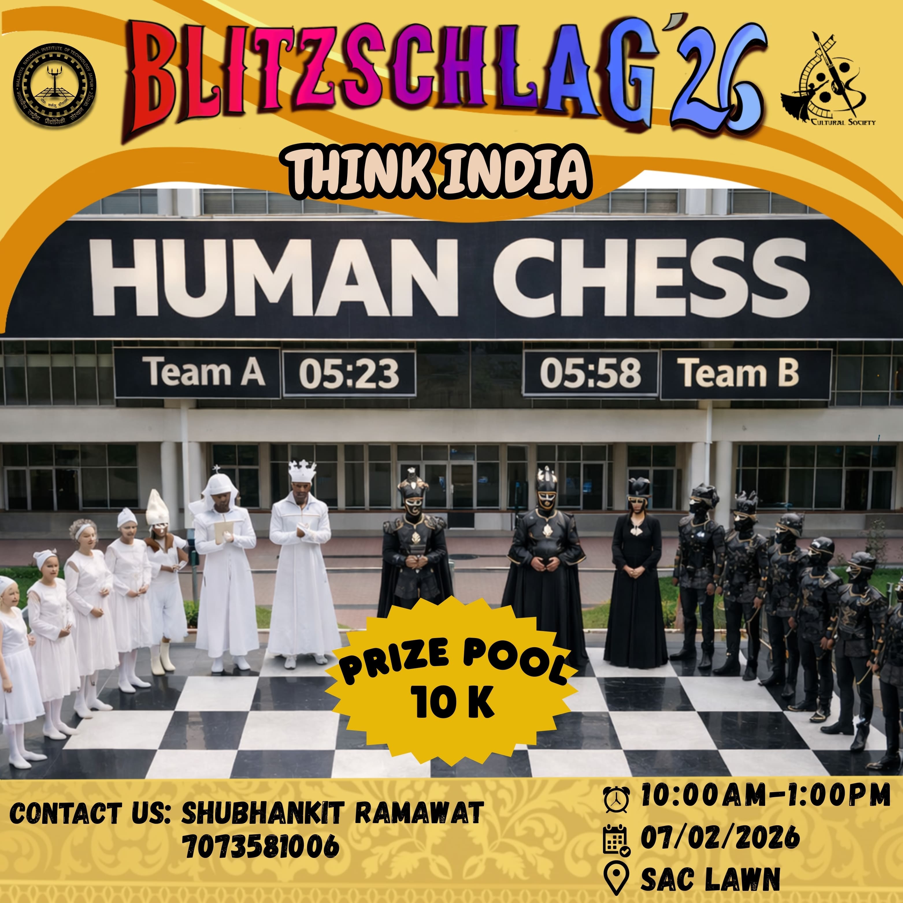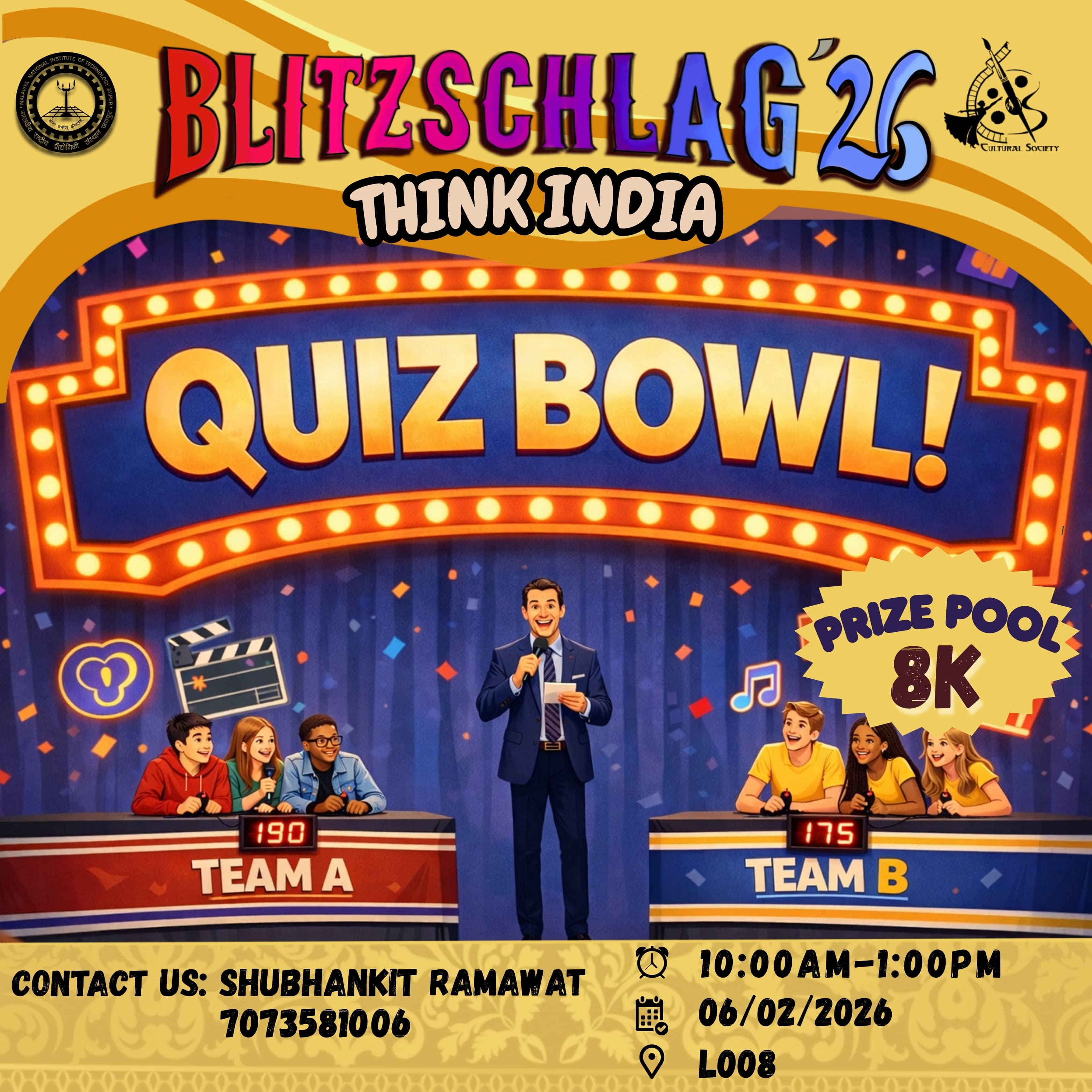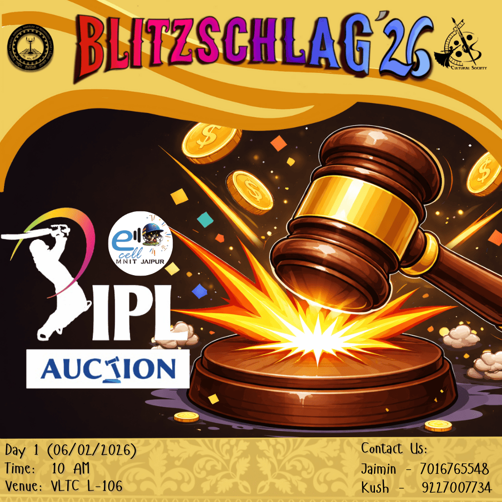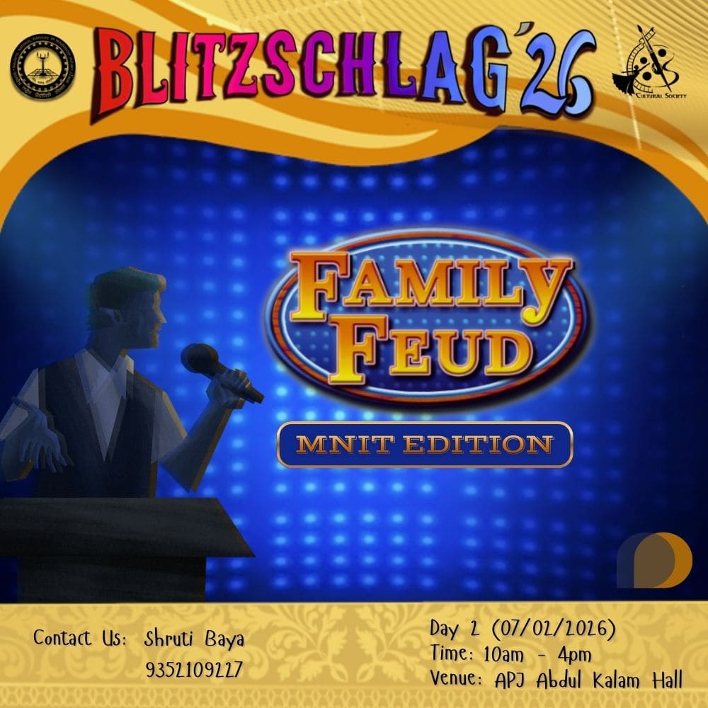 Family Feud – MNIT Edition will feature two teams competing face-to-face, where a buzzer decides who answers first. Questions will revolve around college life, campus culture, popular hangouts, academics, and student experiences, with teams earning points based on the survey-style options revealed. Multiple pairs of teams will play in quick 10-minute rounds, keeping the pace fun, engaging, and full of excitement, while celebrating the spirit of MNIT in a lighthearted game-show style.