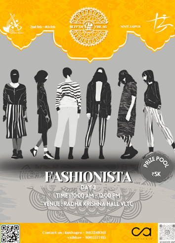 Fashionista is here- the most fashionable show of BLITZSCHLAG where you can explode the box of creativity to put together the craziest fun outfits and captivate all EYES on YOU!✨A Fashion Competition will be held where you will participate in the fashion walk in costumes designed by you. The walk will be of minimum 4 Minutes and maximum 6 Minutes with a background music produced by the teams.