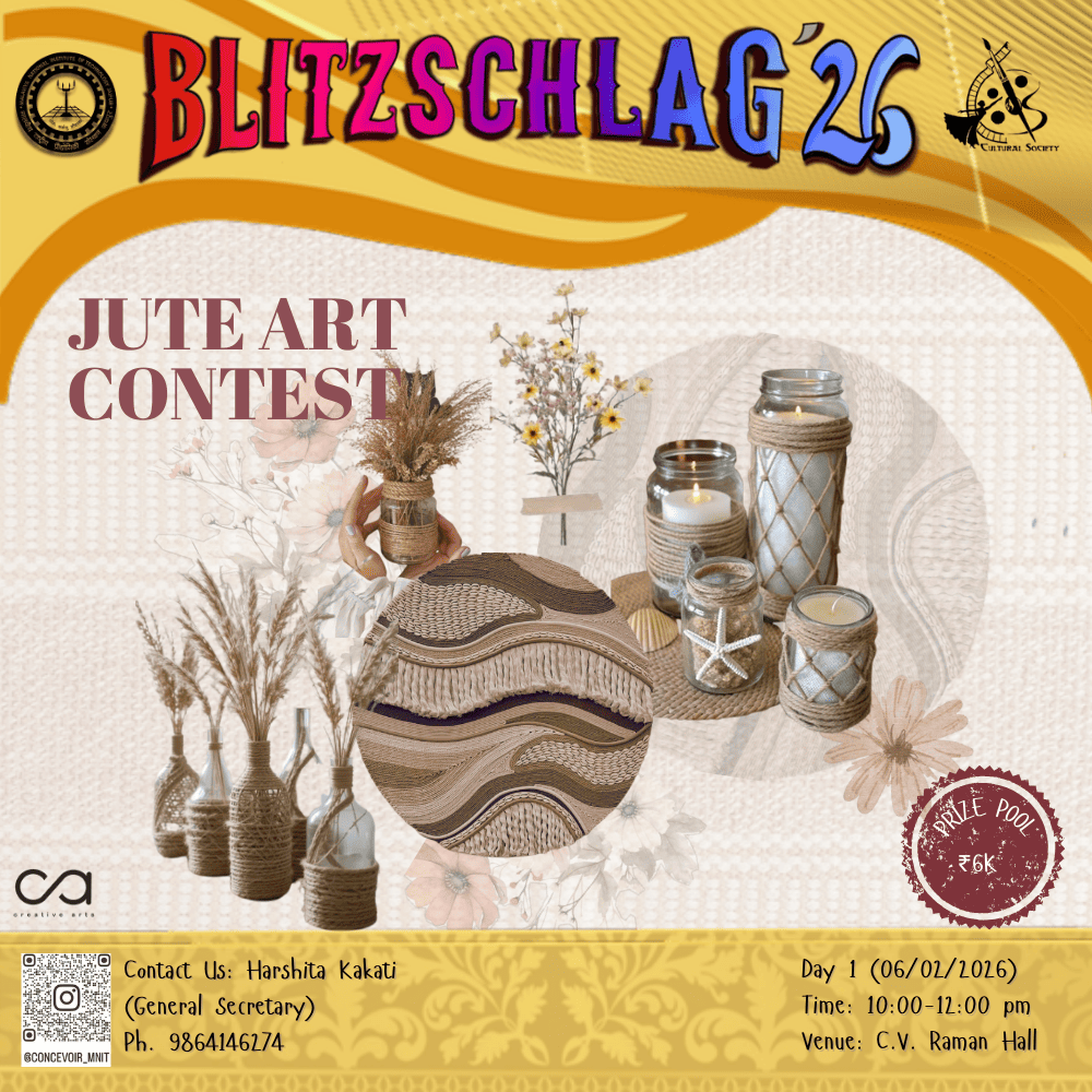 The Jute Art Competition focuses on creating decorative bottle hangings by upcycling plastic/ glass bottles using jute thread as the primary material. Participants will wrap, weave, knot, and design jute around bottles to transform waste into visually appealing and functional hanging art pieces. The competition promotes sustainability, creativity, and traditional craft techniques while encouraging innovative patterns, textures, and finishes. Entries will be evaluated based on originality, craftsmanship, effective use of jute, and overall aesthetic appeal.