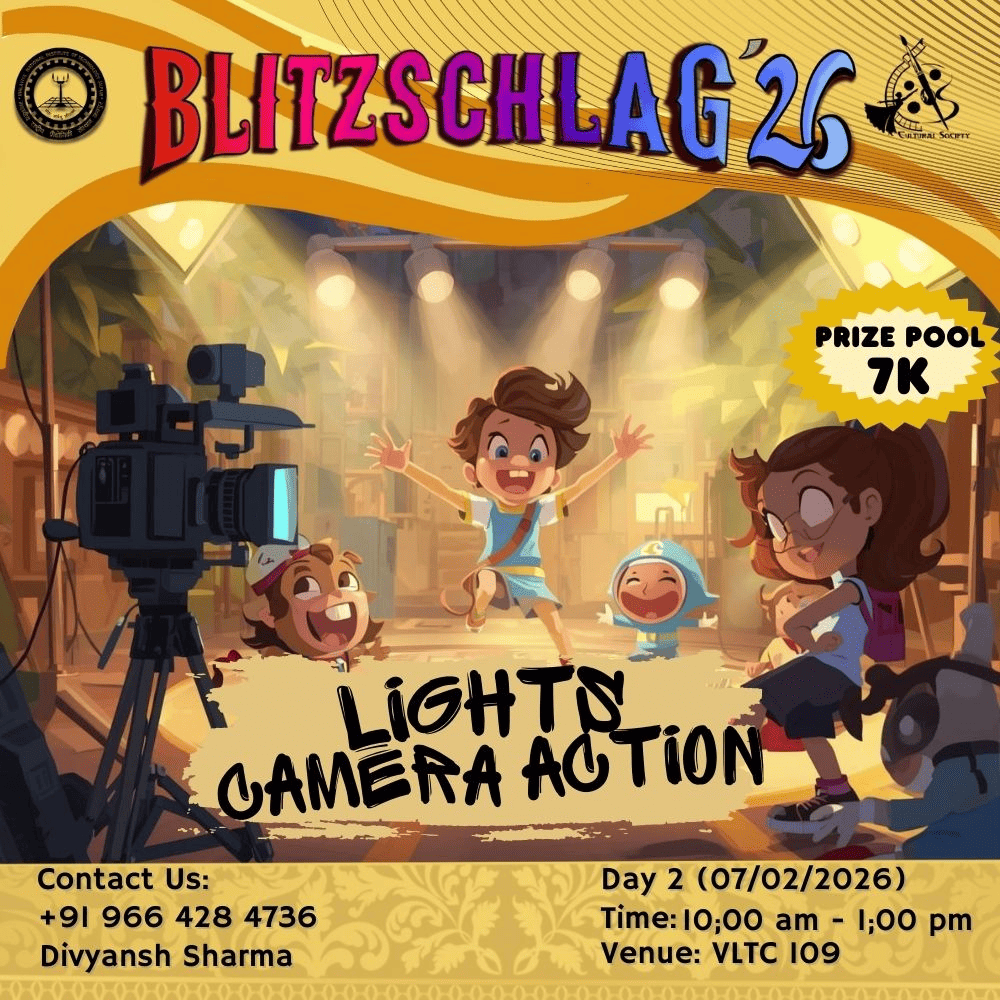 Teams will create short films of 3–10minutes entirely within the festival premises, applying the concepts and techniques learned during our event of Film making workshop conducted in Day 1. This hands-on filmmaking challenge is designed to simulate a real-world production environment within a limited time and space. Participants will be responsible for the complete filmmaking process, including idea development, scripting, direction, acting, cinematography, sound, and editing. This ensures holistic exposure to film production while encouraging teamwork, creativity, and problem-solving under time constraints. Throughout the shoot, mentors and supervisors will be present to guide teams at every stage, offering creative and technical feedback, ensuring smooth execution, and maintaining a structured workflow without limiting artistic freedom. This mentorship-driven approach helps participants refine their storytelling and technical skills in a practical setting. To further enhance engagement and learning, the activity will be followed by an interactive film quiz, testing participants’ knowledge of cinema, filmmaking techniques, and visual storytelling in a fun and competitive format. This segment adds an element of excitement while reinforcing key concepts from the workshop. Overall, the event combines practical filmmaking experience, guided mentorship, and interactive learning, making it an immersive and rewarding experience for all participants.