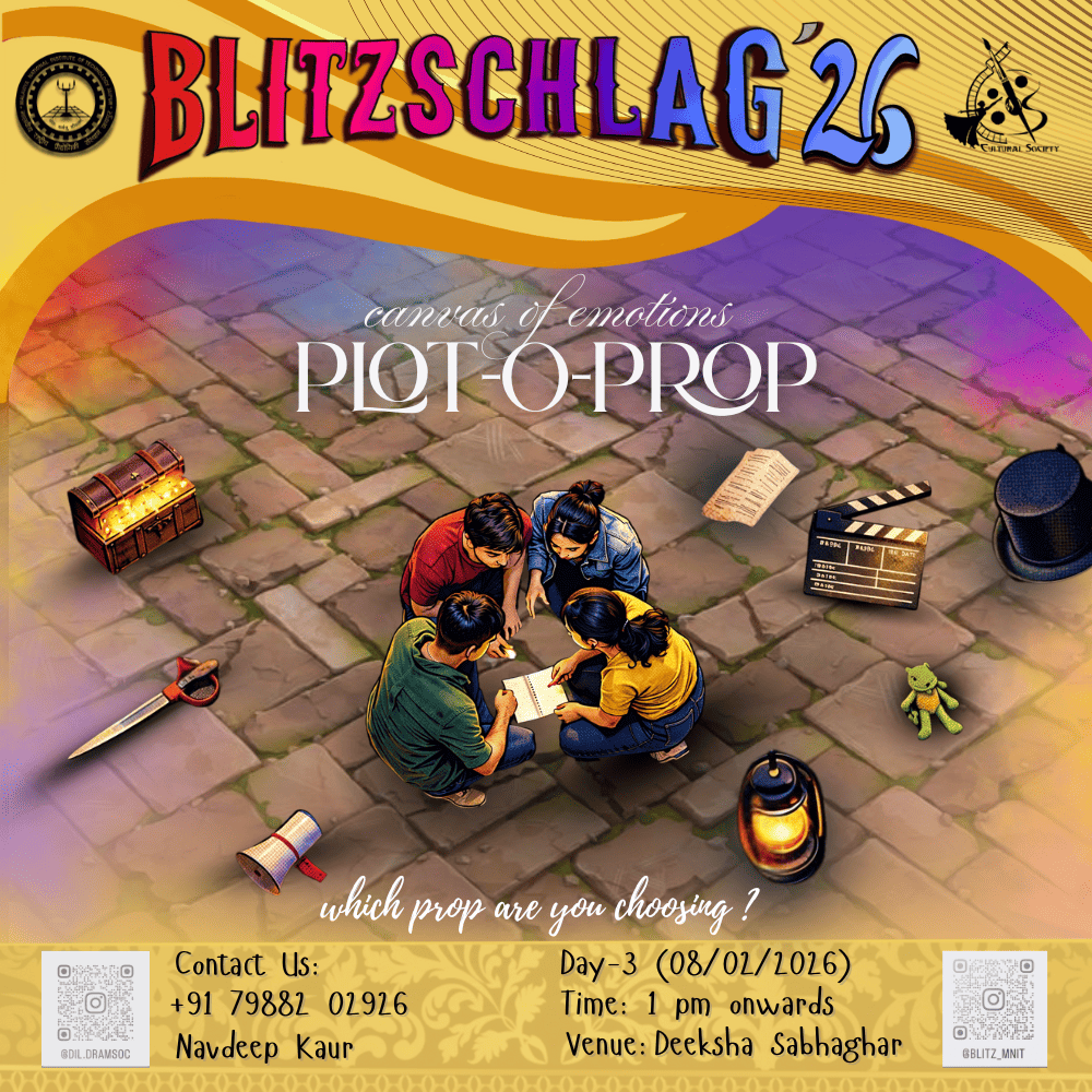 This Event is organised to let the teams perform self-written stage plays. The lighting, songs, music, dialogues, characters, etc make a stage play. Teams from all over the Indian Universities actively participate to showcase their talents. The judging criteria includes time limit, expressions, story line, depiction, lighting, costumes,music etc. This is one of the most competitive events as per the active participation of highly experienced teams all over the India. This is an event fun to watch but hard to win. Blitz'23 had witnessed a footfall of 120+ members.