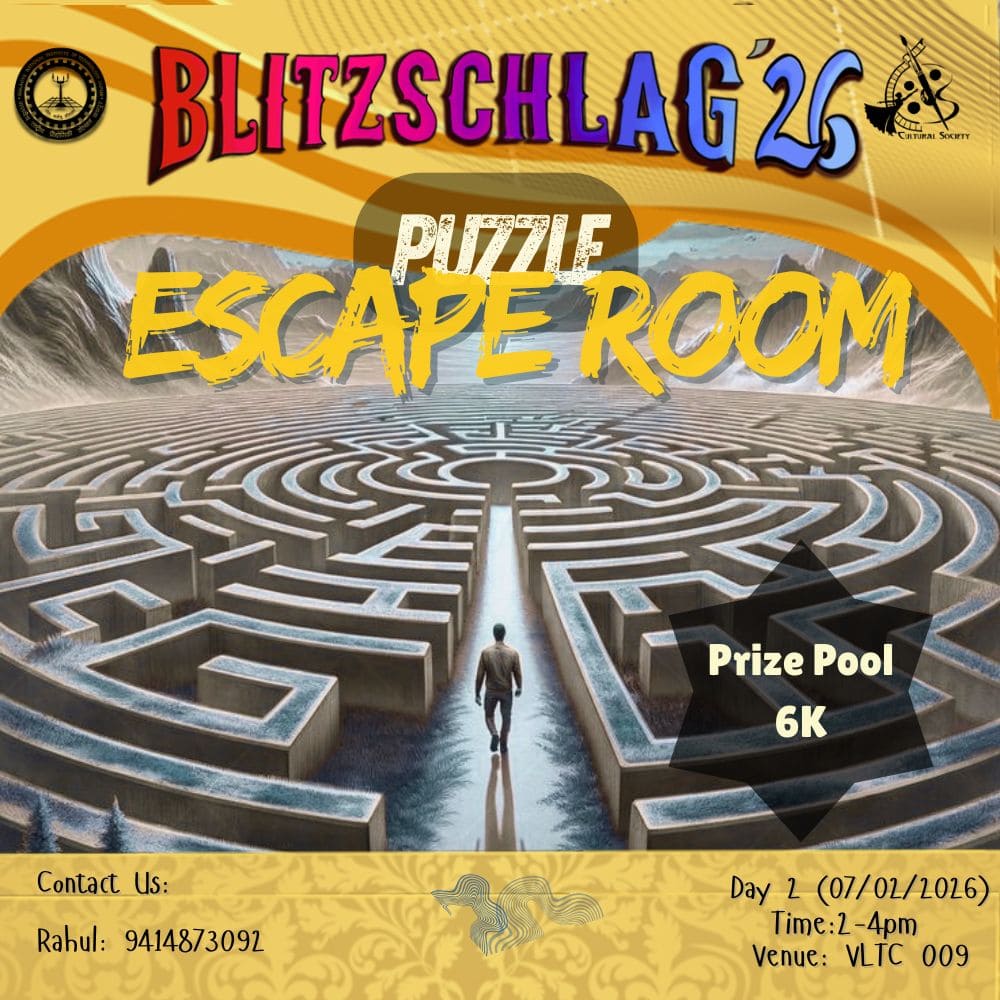 Each team will enter a closed room filled with clues, locks, codes, hidden hints, pattern puzzles, mini-mysteries, and interactive tasks. The goal is simple: Solve all the puzzles and escape room before time runs out. Teams will get 10 minutes inside the room. The team that escapes the fastest—or solves the maximum puzzles—wins exciting prizes.