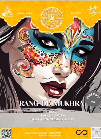 The Creative Arts Club is hosting an entertaining contest for you all. Rang de Mukhra, sounds fun right? trust me, it's more than that. You'll know it once you're there, so pick up your brushes and be there and join us. The participation will be done in a team of 2 members. Theme will be given by picking up the chits.