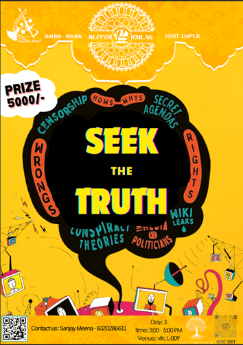 The club shall report the news as reporters and try to convince the audience into believing a fake news piece and an eccentric real news piece, and then try to get the audience to guess which one of the two is true. This will be a buzzer round conducted in groups where each team has to differentiate between the presented fake and real news and uncover the truth. Each team will compete against another for points to finally become the winner.