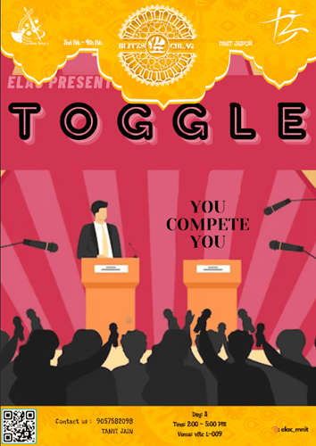 Students will be given a topic on the spot, the student will start speaking for the motion, if a person from our team says toggle the student on the stage will run towards the other side of the stage and start speaking against the motion now again if toggle is said he'll run and speak for the motion and so on.