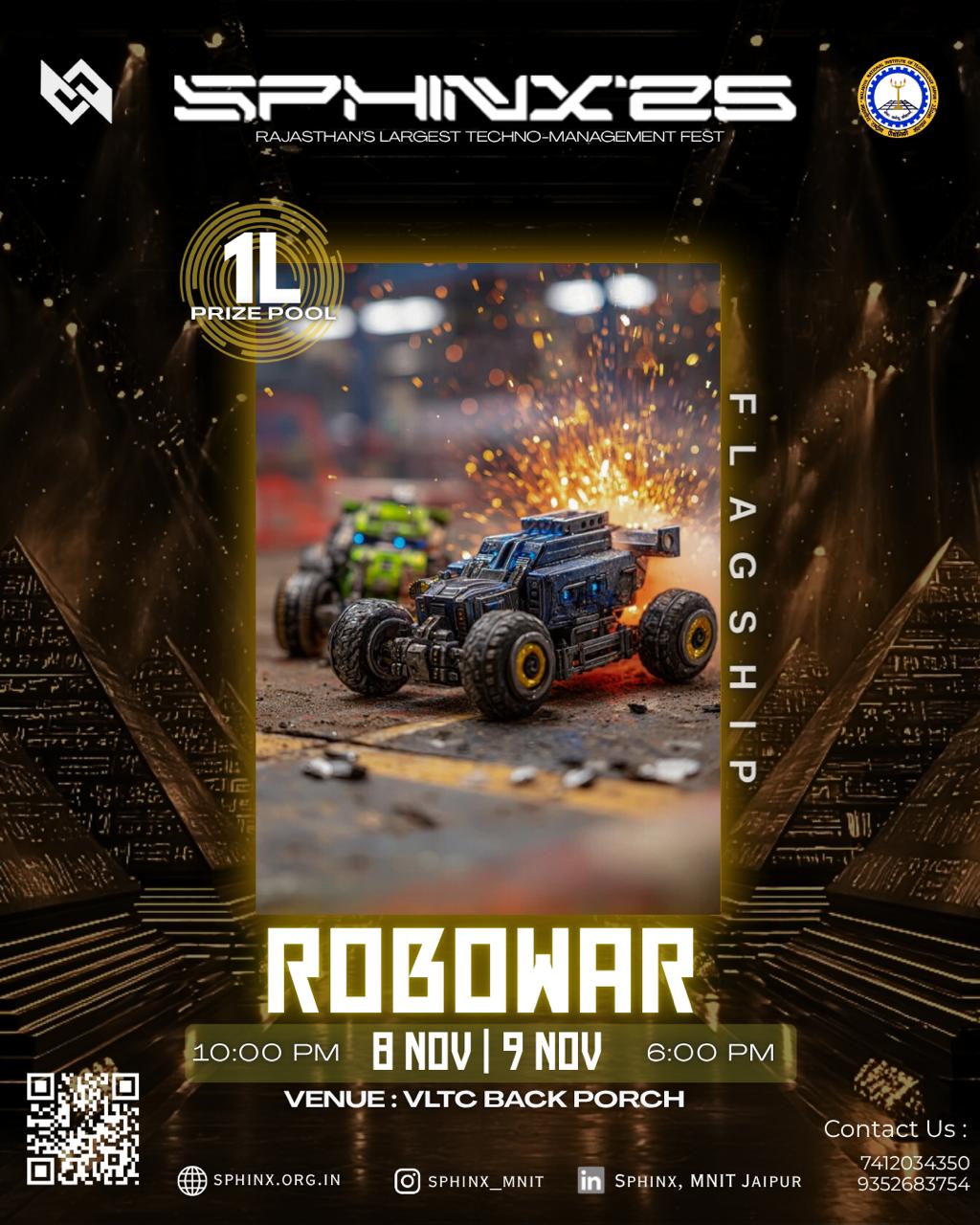 Robowars, Sphinx's premier combat robotics competition, challenges teams to build and battle advanced machines in a high-stakes arena. This flagship event is a rigorous test of innovative engineering, robust construction, and tactical control.