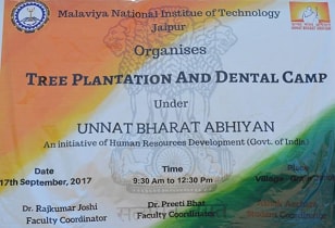 Tree plantation and dental check-up camp were organized by Malaviya National Institute of Technology, Jaipur at village Jirrota, District Jaipur on 17th September 2017. The camp was organized by UBA team (MNIT) headed by faculty coordinators Dr. Preeti Bhatt and Dr. RajKumar Joshi with Mr. Ashok Aechara (General secretary, social activity, UBA MNIT Jaipur), Ms. Arushi Maheshwari (General Secretary, Technical activity ,UBA MNIT Jaipur), Mr. Dhananjay Verma (Joint Secretary of Jirrota village) and 36 enthusiastic students and a team of well qualified doctors: Dr Jitendra and Dr. Mona .